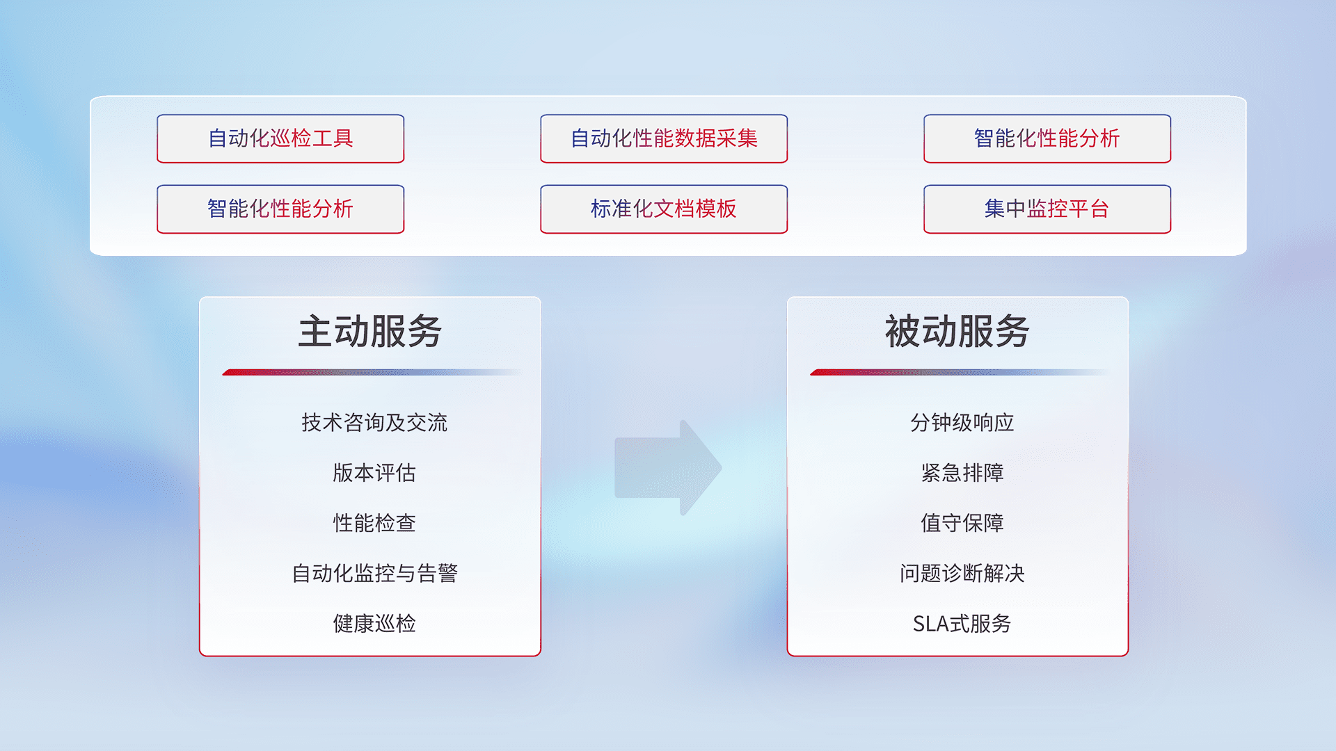 智能化工具和标准化文档,,保障服务质量,,,,提供主动服务(包含技术咨询、、、、版本评估、、、、性能检查、、、自动化监控与告警、、健康巡检)和被动服务包含(分钟级响应、、、、紧急排障、、、值守保障、、、问题诊断解决、、、SLA服务)。。。